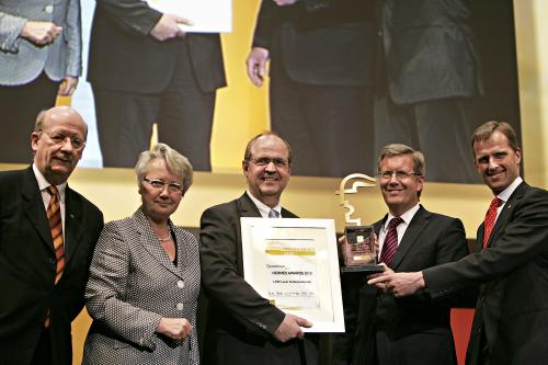 ![]() Der Hermes Award für LPKF: (v.l.) Professor Wolfgang Wahlster (Vorsitzender der Jury), Anette Schavan (Bundesministerin für Bildung und Forschung), Dr. Ingo Bretthauer (Vorstandsvorsitzender LPKF AG), Christian Wulff (Niedersächsischer Ministerpräsident), Dr. Wolfram v. Fritsch (Vorstandsvorsitzender Deutsche Messe AG). Die Idee ist bestechend: Bereits vorhandene Kunststoffbauteile werden mit Leiterbahnen versehen und übernehmen zusätzliche elektronische Funktionen. Für die Umsetzung dieser Idee und die Entwicklung zur Großserienfähigkeit wurde LPKF auf der Eröffnungsfeier zur Hannover Messe 2010 mit dem Hermes Award ausgezeichnet, vergeben von einer hochkarätigen Jury aus Presse, Politik und Wirtschaft. Um aus einfachen Spritzguss-Bauteilen hochwertige Elektronikkomponenten zu machen, setzt LPKF ein besonders Verfahren ein. Der Kunststoff ist mit einem Additiv versehen. Der anschließende Laserprozess aktiviert dieses Additiv und hinterlässt eine mikroraue Oberfläche. Auf den aktivierten Strukturen baut sich in der abschließenden Metallisierung Kupfer, Nickel oder Gold auf. Die Strukturierung dreidimensionaler Bauteile allein ist schon eine anspruchsvolle Aufgabe. LPKF hat ein neuartiges Lasersystem mit der Bezeichnung Fusion3D entwickelt, dass diese Aufgabe mit vier Lasern gleichzeitig übernimmt. Damit entfallen bislang erforderliche Zeiten zum Drehen des Bauteils, die Bearbeitungsgeschwindigkeit steigt bis auf das Fünffache, und das bei gesteigerter Präzision, so das Unternehmen. Das Paket aus Verfahren und Lasersystem war die Grundlage für die Nominierung. Neben dem Innovationsgehalt ist auch die wirtschaftliche Bedeutung ein Bewertungskriterium. Mit den seit Sommer 2009 verfügbaren neuen Systemen habe sich die Produktionskapazität im derzeitigen Haupteinsatzgebiet Handy-Antennen von 20 Millionen 2009 auf 100 Millionen für das Jahr 2010 erhöht. Auch in anderen Bereichen wie der Automobilindustrie, Medizin- und Elektrotechnik verzeichnet LPKF nach eigenen Angaben steigende Nachfrage. Über LPKF LPKF Laser & Electronics AG produziert Maschinen und Lasersysteme, die in der Elektronikfertigung, der Medizintechnik, der Automobilindustrie und bei der Herstellung von Solarzellen zum Einsatz kommen. Rund 20 Prozent der Mitarbeiter sind im Bereich Forschung und Entwicklung beschäftigt. Weitere Informationen: www.lpkf.de |
