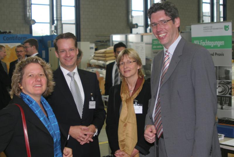 ![]() (v.l.n.r.) NRW-Wissenschaftsministerin Svenja Schulze, IKVProfessor Christian Hopmann, kunststoffland-Geschäftsführerin Dr. Bärbel Naderer und Aachens Oberbürgermeister Marcel Philipp im IKV (Bild: IKV) NRW-Wissenschaftsministerin Schulze am IKV Eröffnet wurde die Veranstaltung von Svenja Schulze, Ministerin für Innovation, Wissenschaft und Forschung des Landes NRW. Zunächst aber begrüßte der Oberbürgermeister der Stadt Aachen, Marcel Philipp, die Gäste herzlich. kunststoffland-Geschäftsführerin Dr. Bärbel Naderer und IKV-Institutsleiter Professor Dr.-Ing. Christian Hopmann leiteten dann über zu den Vorträgen aus der aktuellen IKV-Forschung. Die beiden Organisatoren verfolgten mit der Veranstaltung zwei Ziele. Zum einen setzten sie ein klares Zeichen der Bedeutung der Kunststoffbranche für das Land Nordrhein-Westfalen. Zum anderen vertieften kunststoffland und IKV den Dialog zwischen Industrie und Forschung weiter. Dieser Dialog sei wichtig, und deshalb sendeten Schulze, Philipp, Hopmann und Naderer eine klare Botschaft: Nur das Miteinander von Forschung und Industrie sichert die Wettbewerbsfähigkeit des Landes und seiner Menschen. Ministerin Schulze brachte das in ihrer Rede auf den Punkt: „Viele KMU verfügen selber über nur unzureichende oder gar keine eigene Forschungs- und/oder Entwicklungskapazitäten. Sie sind auf eine Zusammenarbeit mit Hochschulen und Forschungsstellen zwingend angewiesen. Nur damit erhalten sie ihre Innovationskraft und letztlich ihre Wettbewerbsfähigkeit. Wettbewerbsfähigkeit sichert Beschäftigung und sozialen Wohlstand.“ Drei Vorträge von IKV-Mitarbeitern/innen zeigten exemplarisch das Innovationspotenzial der Forschung. Sie präsentierten neuste Entwicklungen der Spritzgieß-Werkzeugtechnik, die Fertigung von Hybridbauteilen für die Automobilindustrie und das Potenzial mikrostrukturierter Oberflächen von Kunststofffolien – Stichwort „Lotoseffekt“. Danach folgte die Gelegenheit zur Institutsbesichtigung. Hier konnten sich die Teilnehmer mit Live-Demonstrationen über aktuelle IKV-Forschungsaktivitäten informieren. Weitere Informationen: www.ikv-aachen.de, www.kunststoffland-nrw.de |