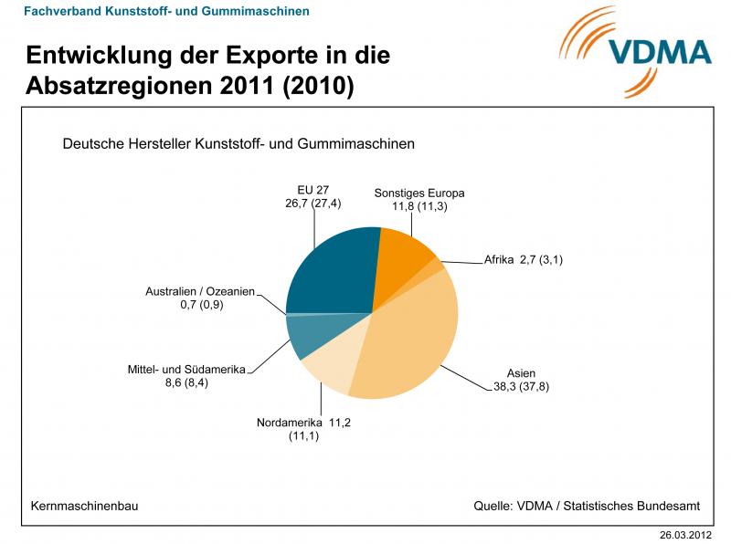 Spitzenzuwächse in China und Ostasien China baute 2011 seine Top-Position als wichtigster Absatzmarkt für Kunststoff- und Gummimaschinen Made in Germany weiter aus. Die deutschen Exporte sind noch einmal um 30,5 Prozent angestiegen - nach mehr als 60 Prozent im Jahr zuvor - und erreichten damit ein Liefervolumen von 766,4 Millionen Euro. „Das ist ein neuer Rekordwert für China“, so Ulrich Reifenhäuser, Vorsitzender des Fachverbandes Kunststoff- und Gummimaschinen im VDMA, „und gleichzeitig das höchste Exportvolumen im Fachzweig, das jemals in ein einzelnes Land geliefert worden ist.“ Mit einer Rate von 40,9 Prozent weist die gesamte Absatzregion Ostasien demnach eine starke Steigerung aus. Auch die Lieferungen in die Republik Korea sind erneut stark gestiegen (um 82,4 Prozent); das Land liegt damit 2011 auf Rang 6 der wichtigsten Absatzmärkte. Die Kunden in Taiwan (33,4 Prozent) haben mit einem Bestellplus von 33,4 Prozent ebenfalls überdurchschnittlich zugelegt. Der Anteil Asiens an den gesamten deutschen Exporten ist auf 38,4 Prozent gestiegen. Spitzenwert weit übertroffen Die deutschen Exporte von Kunststoff- und Gummimaschinen stiegen im Jahr 2011 um 30,5 Prozent. Basierend auf den Meldungen an das Statistische Bundesamt erreichte der Exportwert damit 4.324 Millionen Euro. Im Jahr zuvor waren die Auslandslieferungen bereits um 25,6 Prozent angestiegen. „Damit ist nach zwei sehr guten Export-Jahren der Einbruch aus 2009 ausgeglichen und der Rekordwert von 2008 deutlich eingestellt“, erklärt Thorsten Kühmann, Geschäftsführer des VDMA-Fachverbandes. Die Regionen im Einzelnen Fast alle Absatzregionen trugen 2011 zum Zuwachs bei. Die Exporte in die EU 27 nahmen um 26,9 Prozent zu, mit Frankreich als Hauptmarkt und mit deutlichem Vorsprung, gefolgt von Polen, Italien und Österreich. Überdurchschnittlich um 36,7 Prozent legten die Lieferungen ins Sonstige Europa zu. Wichtigste Kunden dieser Region bleiben Russland - inzwischen deutlich erholt - und die Türkei. In Nordamerika (erneuter Zuwachs um 30,7 Prozent) steigerten die USA wie schon im Vorjahr ihre Bestellungen um mehr als ein Drittel, die überdurchschnittliche Zuwachsrate Mittelamerikas (48,3 Prozent) wird vom Nachfrageanstieg aus Mexiko getragen. Das Plus bei den Exportlieferungen nach Südamerika blieb mit 27,4 Prozent leicht hinter dem Durchschnitt zurück. Hier liegen Argentinien und Chile fast gleichauf mit weitem Abstand hinter Brasilien. Der Nahe und Mittlere Osten hat sich mit einem Wachstum um 11,2 Prozent in einzelnen, aber nicht allen Ländern wieder stabilisiert. Das Plus in Zentral- und Südasien wurde größtenteils in Indien generiert. In Südostasien (23,0 Prozent) hat Thailand wieder Indonesien vom Spitzenplatz verdrängt. Das einziges Minuszeichen von 7,5 Prozent für Nordafrika ist dem ‚Arabischen Frühling´ geschuldet. Insbesondere der Rückgang der Lieferungen ins größte Abnehmerland, Ägypten, trug dazu bei. Deutsche Nachfrage nach ausländischen Maschinen ebenfalls Spitze Die Lieferungen ausländischer Hersteller von Kunststoff- und Gummimaschinen an Kunden in Deutschland schnellte in 2011 ebenfalls auf einen neuen Rekordwert: die Importe stiegen um 49,5 Prozent auf nun 946 Millionen Euro. Hauptlieferländer waren Österreich, die Schweiz und Italien. Weitere Informationen: www.vdma.org/plastics |