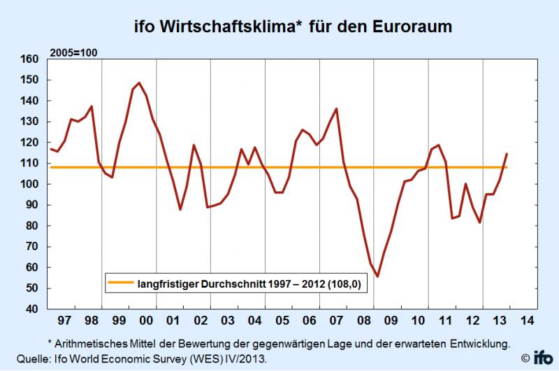 Der ifo Indikator für das Wirtschaftsklima im Euroraum ist weiter gestiegen und übertraf erstmals seit Ende 2011 wieder seinen langfristigen Durchschnitt. Auch wenn sich die aktuelle Lage im Euroraum etwas aufgehellt hat, wird sie weiterhin als ungünstig angesehen. Eine hohe Arbeitslosigkeit, öffentliche Haushaltsdefizite und fehlende Nachfrage machen nach wie vor vielen Ländern zu schaffen. Der konjunkturelle Ausblick für die nächsten sechs Monate hingegen ist deutlich optimistischer als noch vor drei Monaten. Die Erwartungen liegen auf dem höchsten Stand seit rund drei Jahren. Das gute Ergebnis kommt aber vor allem aufgrund der Meldungen aus Deutschland zustande, das als größtes Land viel Gewicht hat. Die Spaltung in der Konjunktur zwischen dem Norden und Süden hat sich verstärkt. Die aktuelle Wirtschaftslage hat sich in Griechenland, Italien, Portugal, Spanien und Zypern gegenüber dem Vorquartal kaum geändert und bleibt in diesen Ländern auf Krisenniveau. In Irland, Slowenien und den Niederlanden hat sich die Situation den befragten Experten zufolge wieder etwas verschlechtert. Die Konjunkturbewertungen für Belgien, Finnland und Frankreich haben sich im Vergleich zum Vorquartal zwar etwas aufgehellt, zeugen aber dennoch von einer schwachen wirtschaftlichen Verfassung. Auch in Österreich liegen die Urteile zur derzeitigen Wirtschaftslage weiterhin unter der Marke "zufriedenstellend". Lediglich für Deutschland - wo sich die Situation weiter verbessert hat - und Estland bescheinigen die befragten Wirtschaftsexperten nach wie vor eine befriedigende bis gute konjunkturelle Lage. Die Erwartungen für die nächsten sechs Monate haben sich mit Ausnahme von Belgien und Luxemburg in allen Ländern des Euroraums stark aufgehellt. Einzig in Zypern sind die Konjunkturerwartungen trotz einer Besserung nicht im positiven Bereich. Die mittelfristigen wirtschaftlichen Perspektiven im Euroraum für die nächsten 3-5 Jahre werden von den WES-Experten zuversichtlicher eingeschätzt als vor Jahresfrist. Die von den WES-Experten erwartete Inflationsrate für den Euroraum für 2013 verharrt mit 1,7% auf dem Niveau vom Vorquartal. Während die Kurzfristzinsen in den nächsten sechs Monaten nach Meinung der Befragten weiterhin konstant bleiben dürften, gehen mehr Experten als bisher von steigenden langfristigen Zinsen aus. Der Euro gilt den meisten Experten zufolge derzeit gegenüber dem US-Dollar und dem japanischen Yen als überbewertet. Der Wert des US-Dollar wird ihrer Meinung nach in den nächsten sechs Monaten zunehmen. Weitere Informationen: www.ifo.de |