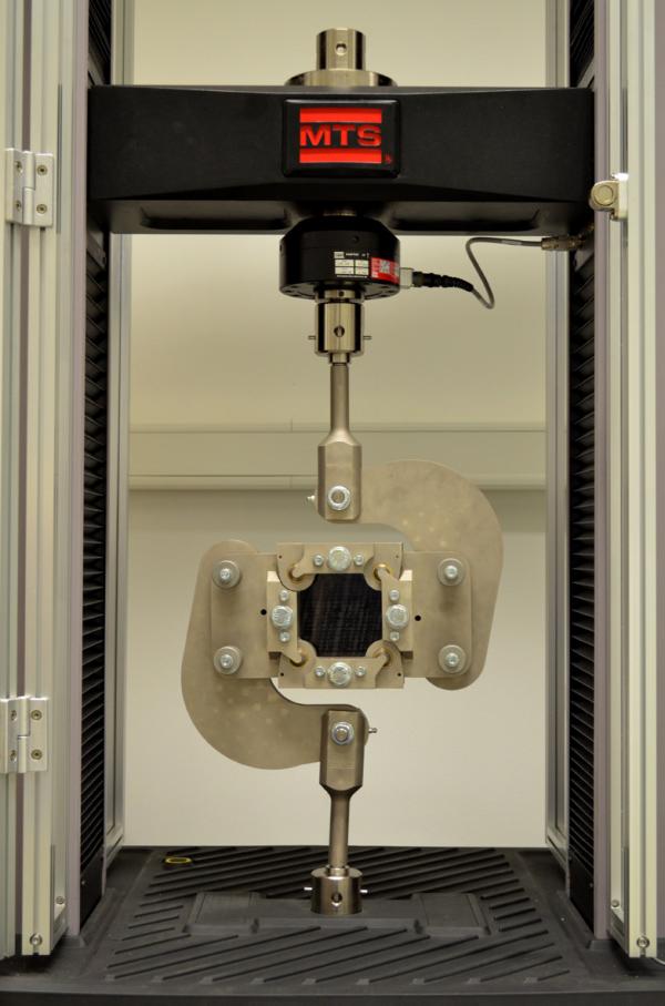 ![]() Der Schubrahmen der Grasse Zur Ingenieurgesellschaft mbH im Einsatz in einer Standard-Zugprüfmaschine. Aufgrund ihrer exzellenten Werkstoffeigenschaften - sehr hohe Festigkeiten und Steifigkeiten bei sehr geringem Gewicht - besitzen Faserverstärkte Kunststoffe (FVW) ein hohes Potenzial, um Produkte gleichzeitig leichter und stabiler zu machen. Da es theoretisch eine unendliche Anzahl an verschiedenen FVW gibt, kommt der Werkstoffprüfung bei FVW eine besonders große Bedeutung zu. Das in der DIN SPEC 4885 standardisierte Prüfverfahren wurde an der Bundesanstalt für Materialforschung und -prüfung (BAM) entwickelt und im Rahmen einer Dissertation wissenschaftlich bewertet. Das Schubprüfverfahren bietet einige Vorteile für die Kennwertbestimmung im Vergleich zu bestehenden Verfahren: