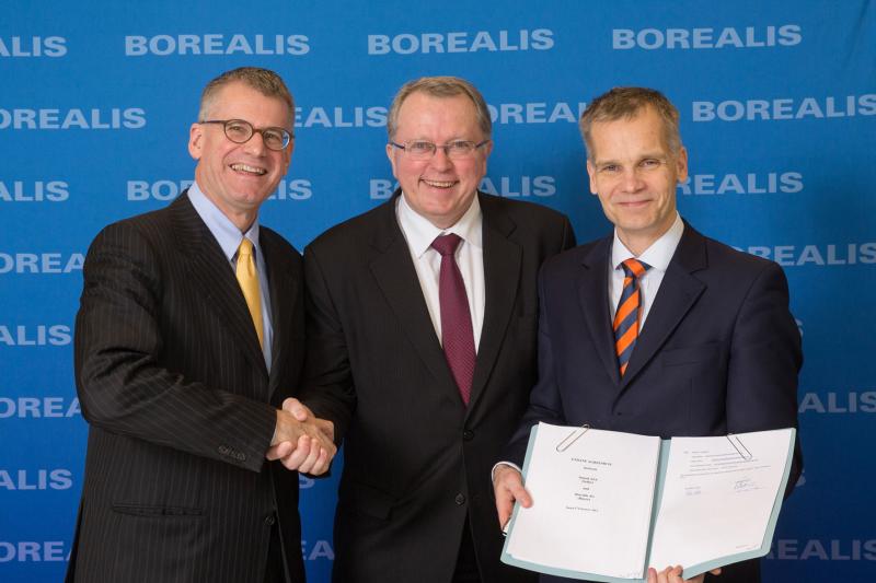 ![]() v.l.n.r.: Mark Garrett, Borealis CEO; Eldar Sætre, Executive Vice President, Statoil; Markku Korvenranta, Executive Vice President Base Chemicals - (Bild: Borealis). Der Liefervertrag wurde zwischen Borealis und Statoils Erdgasanlage in Kårstø, Norwegen, erneuert. Er wird den Angaben zufolge wichtige Ethanlieferungen für Borealis’ Cracker in Stenungsund in den kommenden Jahren sicherstellen. Die Ethanversorgung wurde zu für beide Parteien attraktiven Konditionen beschlossen, wobei die globale Veränderung des Ethanmarkts durch die Verfügbarkeit von US-amerikanischem Schiefergas berücksichtigt wurde. Der neue Vertrag tritt mit Oktober 2015 in Kraft und gilt für einen Zeitraum von sieben Jahren. Der Borealis-Cracker in Stenungsund gilt als einer der in Bezug auf Rohstoffe flexibelsten Cracker Europas. Neben Ethan können hier auch Naphta, Propan und Butan weiterverarbeitet werden. Stenungsund verfügt über umfangreiche Flüssiggas- (LPG) Lagerkapazitäten. Das Unternehmen kann daher LPG aus Quellen unterschiedlicher Größe beziehen, angefangen vom kleinen Frachtschiff bis hin zum riesigen Gastanker. „Der neue Ethanvertrag wird die kontinuierliche Versorgung des Stenungsund-Crackers mit Ethan zu konkurrenzfähigen Preisen sicherstellen“, bestätigt Markku Korvenranta, Borealis Executive Vice President Base Chemicals. „Durch die kurze Fahrtzeit zwischen Statoils Gasförderungsanlage in Kårstø und Stenungsund konnten wir in den vergangenen 14 Jahren die Lieferkette zum Vorteil beider Seiten ohne gröbere Probleme managen.“ „Statoil freut sich, dass ein langfristiger Ethanvertrag mit Borealis abgeschlossen werden konnte. Damit wird eine produktive Beziehung weitergeführt, die seit den 90er Jahren besteht. Als die Ethanlieferungen von Kårstø im Jahr 2000 begannen, war Statoil Miteigentümer von Borealis“, erklärt Tor Martin Anfinnsen, Statoil Senior Vice President Crude Liquids & Products Business Unit. „Diese Vereinbarung verschafft dem norwegischen Ethan und dem Standort Kårstø eine starke und konkurrenzfähige Position in einem Zukunftsmarkt, in dem den europäischen Petrochemieanlagen nun auch Ethan-Rohstoffimporte aus den USA zur Verfügung stehen.“ Steamcracken bzw. Dampfspaltung Steamcracken bzw. Dampfspaltung ist ein Verfahren der Petrochemie, bei dem durch thermisches Cracken längerkettige Kohlenwasserstoffe (Naphtha, aber auch z.B. Propan, Butan und Ethan) in Gegenwart von Wasserdampf in kurzkettige Kohlenwasserstoffe umgewandelt werden. Borealis’ Olefinportfolio in Europa setzt sich aus integrierten Crackern und derivativen Komplexen zusammen: