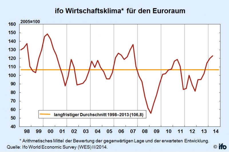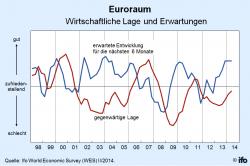 Der ifo Index für die Wirtschaft im Euroraum ist im zweiten Quartal von 119,9 auf 123,0 gestiegen. Er erreichte damit den höchsten Stand seit Ende 2007. Die konjunkturelle Erholung dürfte damit im Laufe der nächsten Monate deutlichere Konturen annehmen. Das Wirtschaftswachstum wird nach Meinung der befragten Experten in diesem Jahr 1,3 Prozent betragen. Die Bandbreite der Schätzungen reicht von -4,9 Prozent für Zypern bis 2,8 Prozent für Lettland. Der Anstieg des ifo Indikators resultiert aus der weniger ungünstigen Beurteilung der augenblicklichen Lage. Der wirtschaftliche Ausblick für die nächsten sechs Monate bleibt unverändert günstig. Deutschland sticht weiterhin mit einer sehr guten wirtschaftlichen Verfassung heraus. In den meisten anderen Ländern des Euroraums ist die Lageeinschätzung dagegen weiterhin gedämpft. Von den Euro-Krisenländern verschlechterte sich den WES-Experten zufolge die derzeitige Lage in Irland. In Griechenland, Italien, Portugal und Spanien lässt sich keine nennenswerte Verbesserung der derzeit katastrophalen wirtschaftlichen Verfassung feststellen. Eine hohe Arbeitslosigkeit, öffentliche Haushaltsdefizite und fehlende Nachfrage machen nach wie vor diesen Ländern zu schaffen. Dennoch signalisieren die Konjunkturerwartungen für die nächsten sechs Monate für den Euroraum insgesamt eine Besserung. Die erwartete Inflationsrate ist seit Ende 2012 kontinuierlich gesunken. Sie liegt nun für 2014 bei erwarteten 1,2 Prozent und damit klar unter der Zielmarke der Europäischen Zentralbank. In diesem Umfeld werden die Kurzfristzinsen im nächsten halben Jahr nach Meinung der Befragten auf dem derzeit niedrigen Niveau verharren. Weniger Teilnehmer als in der vorangegangenen Umfrage erwarten auf Sicht von sechs Monaten einen Anstieg der langfristigen Zinsen. Weitere Informationen: www.ifo.de |