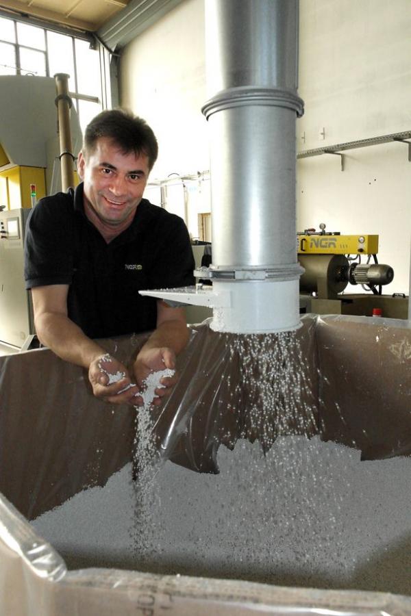 ![]() Ralf Wißmann, Inhaber der Firma RW-Plast, zeigt die hochwertigen Regranulate, die aus Restmaterialien aus der Kunststoffproduktion gewonnen werden können – (Bild: Brit Wollschläger, Ostthüringer Zeitung, www.otz.de). Aufbereitung thermoplastischer Kunststoffabfälle Die neue Anlage vom Typ S:GRAN 95, eine Shredder-Feeder-Extruder-Kombination, ermöglicht die schonende Aufbereitung von beispielsweise Folien, Fasern, Bändchen, Garnen und Vliesen aber auch von Angüssen und ganzen Spritzgussteilen bis hin zu Anfahrkuchen zu Regranulaten. Der zur Zerkleinerung eingesetzte Shredder ist direkt vor dem Extruder angeordnet. Die Zerkleinerung bewirkt dabei nach Anbieterangaben nur einen geringen Temperaturanstieg des Materials, welches demzufolge nur einer geringen thermischen Belastung ausgesetzt ist. Der Extruder mit einem Schneckendurchmesser von 95 mm ermöglicht die Aufbereitung von z.B. PE, PP, PA, PS, PET, ABS, EVA, PPS und Biopolymeren aber auch von Hochtemperaturkunststoffen bis zu 380°C (z.B. Polysulfonfasern). Die Durchsatzleistung der neuen Anlage liegt bei bis zu 400 kg/h. Die Gesamtantriebsleistung liegt bei 248 kW. Die neue Regranulieranlage soll zukünftig im Drei-Schichtbetrieb betrieben werden. Über die RW Plast Kunststoffverarbeitung Die im Jahr 2010 gegründete RW Plast Kunststoffverarbeitung ist als Mahlbetrieb tätig, wobei das Unternehmen sowohl Post Industrial Kunststoffe ankauft, aufbereitet und als Mahlgut weiterverkauft sowie als Lohnverarbeiter tätig ist. Die Veredelung von Kunststoffabfällen zu Regranulaten ist nun ein weiterer Tätigkeitschwerpunkt des Unternehmens. Inhaber der RW Plast Kunststoffverarbeitung ist Ralf Wißmann. Das Unternehmen beschäftigt heute insgesamt vier Mitarbeiter. Weitere Informationen: www.rw-plast.de, www.ngr-world.com |