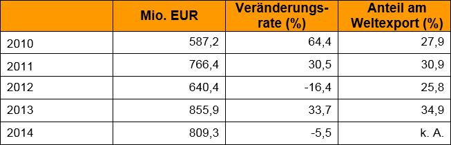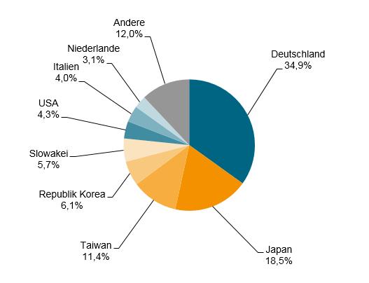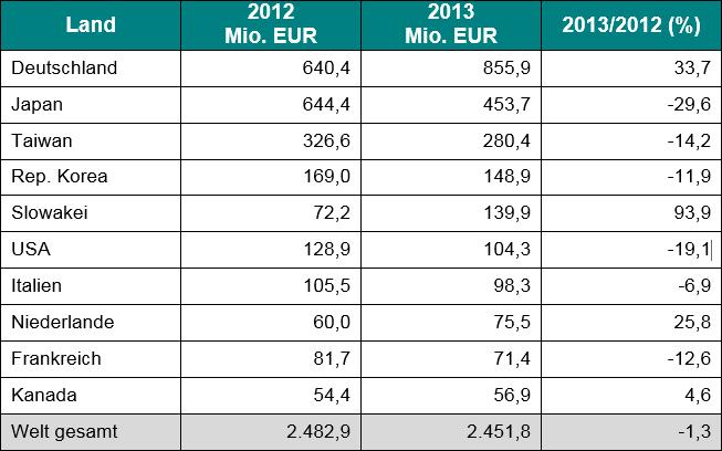 Im Vorfeld der vom 20. bis 23. Mai 2015 in Guangzhou stattfindenden Chinaplas 2015 veröffentlicht der VMDA - Fachverband Kunststoff- und Gummimaschinen aktuelles Zahlenmaterial und Informationen zu den deutschen und internationalen Exportlieferungen von Kunststoff- und Gummimaschinen nach China. Deutsche Lieferungen von Kunststoff- und Gummimaschinen nach China Die deutschen Exporte von Kunststoff- und Gummimaschinen nach China beliefen sich in 2014 auf 809,3 Mio. Euro, das ist ein Minus von 5,5 %. Weltmaschinenlieferungen von Kunststoff- und Gummimaschinen nach China Die weltweiten Lieferungen von Kunststoff- und Gummimaschinen nach China erreichten in 2013 wieder ein Gesamtvolumen von rund 2,5 Mrd. Euro; der Wert lag 1,3 % unter dem des Vorjahres. Mit einem Anteil von 34,9 % ist Deutschland die Nummer 1 gefolgt von Japan (18,5 %), Taiwan (11,4 %) und Südkorea (6,1 %). Weltexport von Kunststoff- und Gummimaschinen nach China 2013* Wert: 2,5 Mrd. EUR *Weltexportdaten für 2014 stehen noch nicht zur Verfügung. Quellen: VDMA Statistikdatenbank, Außenhandelsdaten aus 52 Berichtsländern Weitere Informationen: www.vdma.org, www.chinaplasonline.com Chinaplas 2015, 20.-23. Mai 2015, Guangzhou, China |