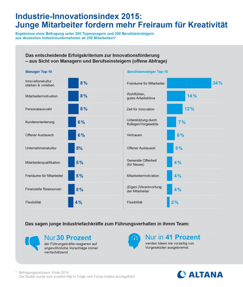 Manager und Berufsanfänger beurteilen sehr unterschiedlich, was die wichtigsten Treiber für Innovationen sind. 34 Prozent der Einsteiger wünschen sich mehr Freiräume für Mitarbeiter. Ein solch eindeutiges Top-Kriterium gibt es aus Sicht der Chefs nicht, Freiräume für Mitarbeiter halten nur 5 Prozent von ihnen für entscheidend. Zu diesen Ergebnissen kommt der branchenübergreifende "Industrie-Innovationsindex 2015". Für die Studie hat das Forsa-Institut im Auftrag des Spezialchemiekonzerns Altana 250 Topentscheider sowie 250 Berufseinsteiger mit einer Berufserfahrung zwischen ein und fünf Jahren in deutschen Industrieunternehmen befragt. Ein gutes Arbeitsklima ist demnach aus Sicht der Berufseinsteiger der zweitwichtigste Faktor für Innovationen. 14 Prozent von ihnen nennen dies als entscheidendes Kriterium. Bei den berufserfahrenen Managern sind es nur zwei Prozent. Platz drei belegt bei den Berufseinsteigern mit zwölf Prozent der Faktor Zeit, beispielsweise für den Austausch mit Kollegen, um gemeinsam neue Ideen zu entwickeln. Diesen Bedarf sehen nur zwei Prozent der Manager. Insgesamt fallen die Antworten der Manager auf die offene Frage nach den größten Innovationstreibern heterogen und weniger konkret aus. Die meistgenannten Faktoren bei ihnen sind mit jeweils acht Prozent das Schaffen und Vorleben einer Innovationskultur, die stärkere Motivation oder Einbindung der Mitarbeiter sowie die richtige Personalpolitik und -auswahl. Unkonventionelle Ideen fördern, nicht ausbremsen "Die Manager haben eher den Blick für das große Ganze, was auch so sein sollte", sagt Altana Vorstandsvorsitzender Dr. Matthias L. Wolfgruber. "Wenn es aber darum geht, konkrete Maßnahmen abzuleiten, um Innovationskraft zu fördern, sollten sie ein offenes Ohr für die konkreten Ideen der Mitarbeiter haben." Wichtig ist dabei unter anderem, auch ungewöhnliche Vorschläge wertzuschätzen. Hierbei hat die Führungsriege der deutschen Industrie noch Potenzial: Bislang sagen 30 Prozent der Berufseinsteiger uneingeschränkt, dass sie diese Wertschätzung erhalten. 41 Prozent geben an, dass Ideen niemals von Vorgesetzten ausgebremst werden. "Kreative Vorschläge sollten immer honoriert werden", sagt Wolfgruber. "Dabei muss es sich nicht immer um Volltreffer handeln, die sofort umgesetzt werden. Innovationskultur heißt, sich gedanklich auch mal bewusst auf vermeintliche Abwege zu begeben." Hintergrund zur Studie "Industrie-Innovationsindex 2015" Ende 2014 führte das Marktforschungsinstitut Forsa im Auftrag der Altana Gruppe 500 Telefoninterviews mit Vertretern aus Industrieunternehmen ab 250 Mitarbeitern durch. Es wurden 250 Vorstandsmitglieder, Geschäftsführer und Bereichsleiter interviewt. Parallel dazu befragte Forsa 250 Berufseinsteiger aus Industrieunternehmen zwischen 18 und 35 Jahren mit einer Berufserfahrung von zwei bis fünf Jahren. Weitere Informationen: www.altana.com, www.byk.com |