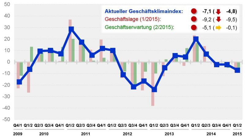 Mit einem Wert von -7,1 liegt der Geschäftsklimaindex für Kunststoffrohre - als Aggregation aus Geschäftslage und Geschäftserwartung - nach Ablauf des 1. Quartals 2015 knapp 5 Punkte unter dem Niveau des 4. Quartals 2014. Der Index für die Geschäftslage liegt im 1. Quartal 2015 mit einem Wert von -9,2 im negativen Bereich und fällt letztlich etwas stärker ab als zunächst erwartet. Dies begründet sich laut KRV insbesondere durch die starken Absatzrückgänge in der Versorgung. Auch in der Entsorgung sowie in der Haustechnik wurde das Absatzniveau des Vorjahresquartals unterschritten, lediglich bei den Industrierohren konnten noch leichte Zuwächse verzeichnet werden. Hauptgründe für das niedrigere Absatzniveau waren ein geringerer Auftragseingang aufgrund verhaltener Investitionstätigkeiten bzw. eine ruhige Marktlage in Verbindung mit tlw. schwieriger Material-/Rohstoffverfügbarkeit. Mit einem Index für die Geschäftserwartung von -5,1 rechnen die Rohrhersteller für das 2. Quartal 2015 insgesamt mit Absatzmengen leicht unter Vorjahresniveau. Mit stärkeren Rückgängen rechnen die Rohrhersteller nach wie vor in der Versorgung - u. a. in Erwartung zunehmender Engpässe in der Rohstoffverfügbarkeit. Einzig in der Haustechnik erwarten die Unternehmen eine leichte Belebung des Marktes mit Absatzmengen leicht über Vorjahresniveau. Zu den zentralen Marktbestimmungsfaktoren zählen nach Ablauf des 1. Quartals 2015 insbesondere die kurzfristige Rohstoffverfügbarkeit aufgrund der massiven Rohstoffverknappung und der der damit verbundenen Entwicklung der Rohstoffpreise. Der KRV-Geschäftsklimaindex wird seit Ende 2008 vom Kunststoffrohrverband erhoben. Im Auftrag des KRV ermittelt das Beratungsunternehmen Consultic GmbH vierteljährlich einen aktuellen, belastbaren und regelmäßigen Indikator über die Entwicklung und Erwartung der Geschäfte. Teilnehmen können alle Hersteller von Kunststoffrohren und Formstücken bzw. (im Bereich Haustechnik) Kunststoffrohr-Systemanbieter zum Preis von € 950,00 p.a. Darin enthalten sind vier Quartalserhebungen mit jeweiliger Detailauswertung und Bericht. Weitere Informationen: www.krv.de |