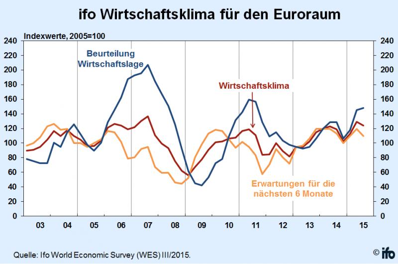 Der ifo Index für die Wirtschaft im Euroraum gab im dritten Quartal 2015 leicht nach und sank von 129,2 auf 124,0 Punkte. Während sich die Beurteilungen zur Lage etwas aufhellten, trübten sich die Erwartungen für die nächsten sechs Monate recht deutlich ein. Die Dynamik des konjunkturellen Aufschwungs im Euroraum dürfte sich abschwächen. Die Bewertungen zur aktuellen Wirtschaftslage verbesserten sich überall mit Ausnahme von Deutschland, Finnland und Litauen. In Deutschland sind sie aber ohnehin schon günstig. In Griechenland und Finnland, aber auch in Frankreich, Italien, Spanien, Österreich, Portugal und Zypern wird die Lage per saldo weiterhin negativ eingeschätzt. In den meisten anderen Euroländern ist sie den Experten zufolge zufriedenstellend. Der wirtschaftliche Ausblick für das kommende halbe Jahr fiel in den meisten Ländern weniger positiv aus als noch vor drei Monaten. Vor allem in den osteuropäischen Mitgliedstaaten Estland, Slowenien und der Slowakei wurden die optimistischen Erwartungen im Hinblick auf die weitere wirtschaftliche Entwicklung stark zurückgenommen. Nur in Finnland, Litauen, Österreich und Zypern haben sich die Konjunkturerwartungen leicht verbessert. Die durchschnittliche Prognose der Inflationsrate im Euroraum für 2015 erhöhte sich von 0,6 auf 0,8 Prozent. Für die mittlere Frist (2020) rechnen die Experten in den meisten Euroländern weiterhin mit einer Inflation von 2 Prozent. Weitere Informationen: www.ifo.de |