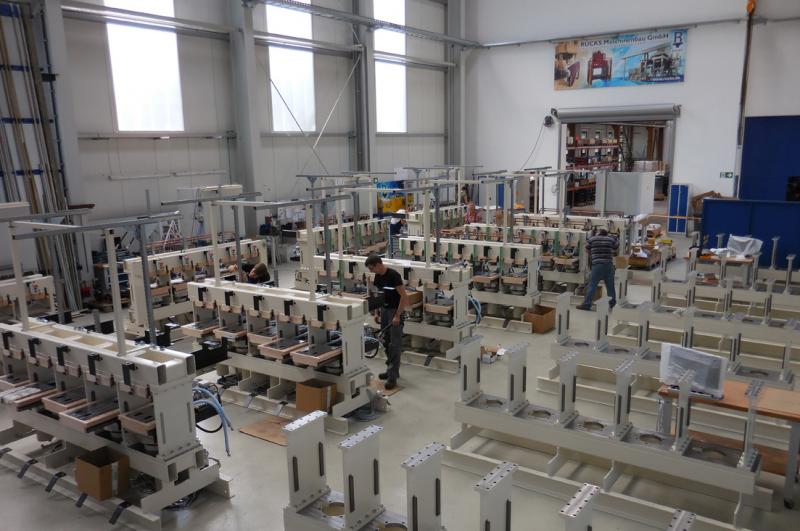 Rucks, spezialisiert auf die Einzelfertigung kundenspezifischer Pressen-Systeme, hat im Herbst 2015 24 Pressengruppen ausgeliefert, bestehend aus insgesamt 120 Pressenzellen, die in einer Kleinserienfertigung hergestellt wurden. Jede der ausgelieferten Pressengruppen besteht aus fünf separat arbeitenden Pressenzellen mit je 200 kN Presskraft. Die Heizplatten haben eine Größe von 400mm x 300mm und werden mit Heißwasser temperiert. Die integrierte Ausfahrfunktion und zwei pneumatische Ausstoßer ermöglichen eine ergonomische und zeitsparende Teileentnahme. Das Gesamtanlagenkonzept sieht eine zentrale Versorgung aller Maschinen mit Hydrauliköl und Heißwasser für die Heizplatten vor. So wurde in jeder Pressengruppe dementsprechend Rohrleitungsmodule integriert, die ein Verbinden aller Maschinen miteinander ermöglicht. Für ein möglichst effizientes Arbeiten an den Maschinen wurden Sonderwünsche wie eine Abfallrutsche, extra Fächer für die Rohmaterialbevorratung oder ein schräges Konsol für die Ablage der fertigen Produkte in jede Pressengruppe integriert. Zur Sicherheit während des automatisch ablaufenden Pressprozesses wird der Pressraum mit einer pneumatisch angetriebenen Schutzscheibe abgeschirmt, was gleichzeitig auch möglichen Temperaturverlusten vorbeugt. Die Steuerung der 24 Pressengruppen geschieht zentral über einen Schaltschrank mit integriertem 15" Grossenbacher Touch-Panel PC. Die Maschinenfunktionen der einzelnen Pressenzellen können hier in übersichtlichen Fenstern auf einen Blick erkannt und geändert werden. Die integrierte Maschinenfernwartung ermöglicht einen schnellen externen Zugriff auf die Maschinen. So kann bei Problemen in kurzer Zeit eine Fehleranalyse und Problembehebung stattfinden und die Maschinenverfügbarkeit optimiert werden. Weitere Informationen: www.rucks.de |