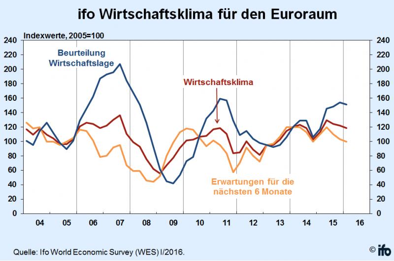 Der ifo Index für die Wirtschaft im Euroraum hat im ersten Quartal 2016 um weitere drei Indexpunkte nachgegeben. Er fiel auf 118,9 Punkte, liegt damit aber weiterhin deutlich über seinem langfristigen Durchschnitt. Die Beurteilung der aktuellen wirtschaftlichen Lage war nur etwas weniger günstig als im Vorquartal. Auch die positiven Erwartungen trübten sich leicht ein. Die Erholung im Euroraum wird sich nur verlangsamt fortsetzen. In Griechenland und Finnland wurde die aktuelle Lage am negativsten beurteilt. Aber auch in Frankreich, Italien und Zypern bleibt die derzeitige Situation angespannt. In Spanien, Portugal und Österreich stellte sich die Lage nur wenig besser dar; allerdings waren für Österreich die Einschätzungen deutlich weniger negativ als im Vorquartal. Die kräftigste Erholung fand in Irland statt: die aktuelle Situation beurteilten die befragten Experten mittlerweile als sehr gut. In Deutschland gilt die Wirtschaftslage als gut, wenn auch die Urteile im Vergleich zum Vorquartal etwas weniger günstig ausfielen. In allen anderen Euroländern berichteten die WES-Experten von einer zufriedenstellenden wirtschaftlichen Situation. Die wirtschaftlichen Aussichten für das kommende halbe Jahr bleiben nahezu überall positiv. In Österreich, Frankreich, den Niederlanden, Estland und Lettland hellten sich die Erwartungen auf. In den übrigen Ländern ist der Ausblick unverändert oder etwas weniger positiv. Lediglich für Griechenland, Portugal und Spanien sind die WES-Experten leicht pessimistisch. Für 2016 rechnen die Experten mit einem Anstieg der durchschnittlichen Inflationsrate auf 1,0 Prozent im Euroraum. Mittelfristig (2021) liegen die Inflationserwartungen im Schnitt unverändert bei 1,9 Prozent. Auch wenn der US-Dollar gegenüber dem Euro weiterhin als leicht überbewertet angesehen wird, ist nach Ansicht der WES-Experten in den nächsten sechs Monaten mit einer weiteren Dollaraufwertung zu rechnen. Weitere Informationen: www.ifo.de |
