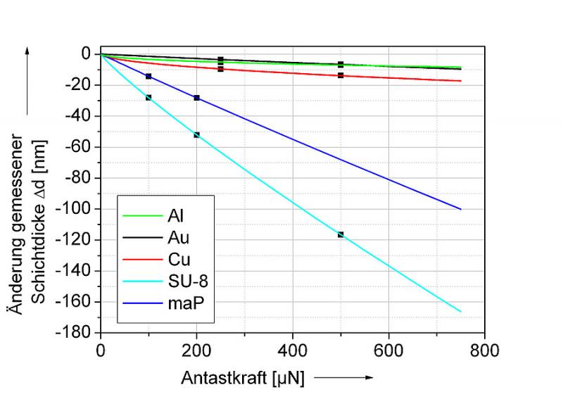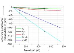 ![]() Referenzfederbalken aus Silizium zur Bestimmung der Antastkraft von Tastschnittgeräten. Aus der Verbiegung des Balkens an einer Endmarke lässt sich die Antastkraft ermitteln. ![]() Die Grafik zeigt die systematische Abweichung eines Tastschnittgerätes in Abhängigkeit von der Antastkraft bei der Messung der Dicke einer weichen Schicht auf einem harten Substrat für drei Metalle und zwei Photoresist-Polymere. Bei optischen Messgeräten sind die wesentlichen Einflussfaktoren die effektive numerische Apertur der verwendeten Optik, die Lage der Reflexionsebene bei volumenstreuenden Materialien und der Phasensprung bei Reflexion. Die Norm beschreibt für Weißlichtmikroskope und fokussierende Messsysteme Verfahren zur Bestimmung dieser Größen und Korrektur von systematischen Abweichungen auf der Basis neuer Normale. Die Forschungsarbeiten fanden im Rahmen des internationalen MeProVisc-Projektes (Dynamic mechanical properties and long-term deformation behaviour of viscous materials) innerhalb des Europäischen Metrologieforschungsprogramms EMRP statt. Ergebnis des Projektes ist ein Vergleich von Kriechmessungen mit der dynamischen instrumentierten Eindringprüfung für viskose Materialien. Die Standardisierung dieser Verfahren ist im Teil 5 der ISO 14577 Norm zur Nanoindentation geplant. Weitere Informationen: www.ptb.de Quelle: Autor: Imke Frischmuth |