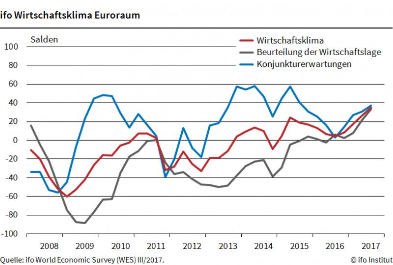 Das ifo Wirtschaftsklima Euroraum hat sich im dritten Quartal erneut deutlich verbessert, von 26,4 auf 35,2 Saldenpunkte. Dies ist der höchste Wert seit Herbst 2000. Die befragten Experten beurteilten insbesondere die aktuelle Wirtschaftslage günstiger als im Vorquartal. Aber auch der Ausblick für die nächsten sechs Monate verbesserte sich weiter. Das starke Wachstum dürfte sich damit im zweiten Halbjahr 2017 fortsetzen. In Deutschland, Frankreich, Italien und Spanien, den vier größten Volkswirtschaften der Eurozone, verbesserten sich Lage und Erwartungen. Die Erwartungen stiegen am deutlichsten in Frankreich. Es gibt jedoch weiterhin Unterschiede bei der Einschätzung der Wirtschaftslage. Die Experten bewerteten sie in Deutschland nun fast einstimmig als gut. Auch in Spanien herrscht eine leicht positive Einschätzung vor. In Frankreich und Italien bewerteten die Experten die Lage noch nicht als zufriedenstellend. Die Inflationserwartungen der Experten für 2017 sanken leicht auf 1,5 Prozent, von zuvor 1,6 Prozent. Die Befragten rechnen mit einem Anstieg der kurzfristigen und insbesondere der langfristigen Zinsen im nächsten halben Jahr. Nach der Aufwertung des Euros gegenüber dem Dollar im letzten Quartal erwarten die Experten einen etwa gleich bleibenden Wechselkurs in den nächsten sechs Monaten. Deutlich verbessert (vor allem in Frankreich) hat sich die Bereitschaft der Banken, Kredite an Firmen zu vergeben. Sie wird nun als weniger restriktiv beurteilt. Weitere Informationen: www.ifo.de |