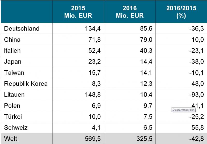 Im Vorfeld der vom 23. bis 26. Januar 2018 in Moskau stattfindenden Interplastica 2018 veröffentlicht der VMDA aktuelles Zahlenmaterial und Informationen zu den deutschen und internationalen Exportlieferungen von Kunststoff- und Gummimaschinen nach Russland. Deutsche Lieferungen von Kunststoff- und Gummimaschinen nach Russland Von Januar bis September 2017 belaufen sich die deutschen Exportlieferungen nach Russland auf 87,9 Mio. Euro, das ist Plus von 49,8 Prozent gegenüber demselben Vorjahreszeitraum. Weltexport von Kunststoff- und Gummimaschinen nach Russland Weltmaschinenlieferungen nach Russland 2016* (Gesamtwert: 325,5 Mio. Euro) *Zahlen für 2016 sind noch nicht verfügbar Quellen: VDMA/Nationale statistische Ämter, Außenhandelsdaten von 52 Berichtsländern Im Jahr 2016 entsprachen die weltweiten Exportlieferungen von Kunststoff- und Gummi-maschinen nach Russland einem Gesamtwert von 325,5 Mio. Euro. Das ist ein Minus von 42,8 Prozent. Deutschland belegt mit einem Anteil von 26,3 Prozent den ersten Platz am Gesamtexport der wichtigsten Lieferländer für Kunststoff- und Gummimaschinen nach Russland, gefolgt von China (24,3 Prozent) und Italien (12,4 Prozent). Deutsche Gemeinschaftsbeteiligung zur Interplastica 2018: 116 Firmen auf 2.300 qm Weitere Informationen: www.interplastica.de, www.machines-for-plastics.com, plastics.vdma.org interplastica 2018, 23.-26.01.2018, Moskau |