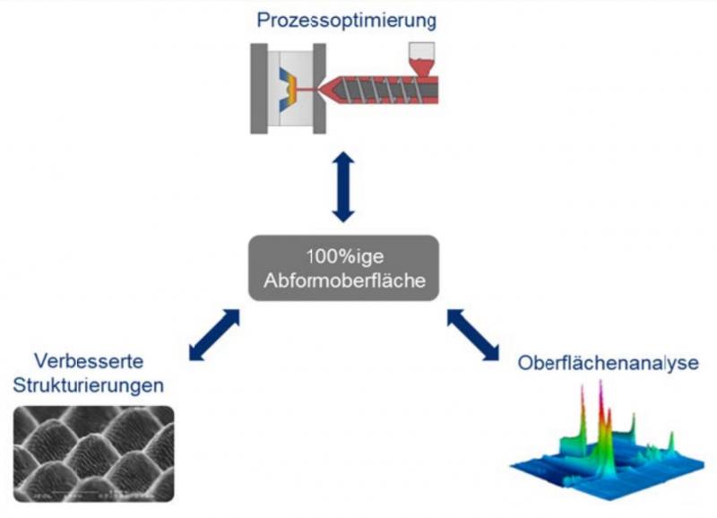 ![]() Entwicklung einer hochgenauen Abformung beim Spritzgießen von stark strukturierten Oberflächen - (Grafik: IKT). Zur Erreichung des Ziels soll die Abformtechnik beim Spritzgießprozess durch partielles und lokales Temperieren sowie die hochstrukturierte Werkzeugoberfläche durch spezifische partielle Strukturierung optimiert werden. Die Qualität des Abformverhaltens von verschiedenen Kunststoffen soll durch eine neuartige Oberflächenmesstechnik standardisiert bewertet werden. Das Projekt wird finanziell durch das Bundesministerium für Wirtschaft und Energie (BMWi) im Rahmen des Förderprogramms „Zentrales Innovationsprogramm Mittelstand – ZIM“ unterstützt. Dabei wird das Institut für Kunststofftechnik die neuartige Oberflächenmesstechnik zur Bewertung der Oberflächenqualität und die Vorhersage der Oberflächenabformung entwickeln. Weitere Informationen: |