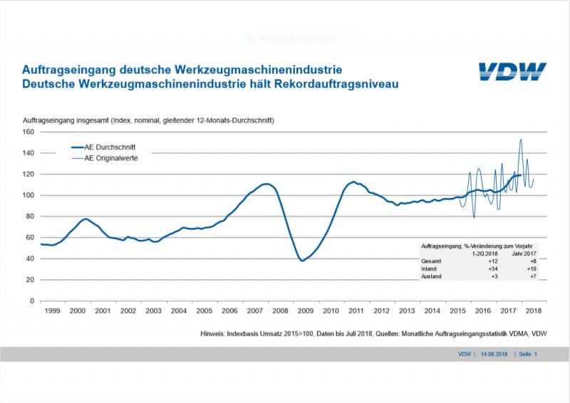 Im zweiten Quartal 2018 stieg der Auftragseingang der deutschen Werkzeugmaschinenindustrie im Vergleich zum Vorjahreszeitraum um 2 Prozent. Dabei legten die Bestellungen aus dem Inland um 29 Prozent zu. Die Auslandsorders sanken um 9 Prozent. Im ersten Halbjahr des laufenden Jahres stiegen die Bestellungen um 12 Prozent. Das Inland zog um 34 Prozent an, das Ausland legte 3 Prozent zu. „Die Bestellungen aus dem In- und Ausland klaffen derzeit weit auseinander“, erläutert Dr. Wilfried Schäfer, Geschäftsführer des Branchenverbands VDW (Verein Deutscher Werkzeugmaschinenfabriken) in Frankfurt am Main. „Investiert wird nach langem Zögern nun endlich im Inland, sowohl in Modernisierung als auch Erweiterung der Kapazitäten. Die Euro-Länder legen ebenfalls knapp zweitstellig zu. Sie bieten eine solide Basis für die Fortentwicklung des Geschäfts. Darüber hinaus lässt die Investitionsdynamik vor allem in Asien nach, weil sich die Nachfrage im größten Markt China politisch gewollt merklich beruhigt. Auch aus Indien und Südkorea war der Auftragseingang rückläufig“, so Schäfer weiter. Die Bestellungen von Zerspanungs- und Umformtechnik entwickelten sich im ersten Halbjahr gleichermaßen gut und zeigten dasselbe Muster für In- und Auslandsaufträge wie die Gesamtbranche. Beschäftigungsrekord aufgestellt Die Beschäftigten erreichten mit fast 73.700 Mitarbeitern und Mitarbeiterinnen im Mai dieses Jahres einen neuen Rekord. Höher lag die Beschäftigung zuletzt Anfang der 90er Jahre des vergangenen Jahrhunderts, direkt nach der deutschen Wiedervereinigung und in den Folgejahren bis 1993. Die Kapazitäten waren im Juli dieses Jahres mit 93,2 Prozent sehr gut ausgelastet. „Tatsächlich stoßen die Kapazitäten an ihre Grenzen“, sagt Schäfer. Laut Ifo-Konjunkturbefragung berichteten über die Hälfte der befragten Werkzeugmaschinenhersteller zur Jahresmitte von Materialknappheit und fast 40 Prozent von Arbeitskräftemangel. „Dahinter stecken Engpässe in der gesamten Zulieferkette. Wichtige Teile sind ausverkauft. Und die Inbetriebnahme, speziell im Ausland, leidet unter Personalengpässen“, erläutert Schäfer. Umsatz brummt Der Umsatz schließlich ist im ersten Halbjahr um 13 Prozent gestiegen. Damit wird die Produktionsprognose des VDW gestützt, die für 2018 einen Zuwachs von nochmals 7 Prozent erwartet. Im Referenzjahr 2017 schnitt die zweite Jahreshälfte deutlich stärke im Vergleich zu den ersten sechs Monaten ab. „Wenn uns die internationale Wirtschaftspolitik mit Brexit, Handelskrieg, Rückabwicklung der Globalisierung, Sanktionsandrohungen nicht in die Suppe spuckt, ist unsere Branche auf einem guten Weg“, sagt Schäfer vom VDW abschließend. Weitere Informationen: vdw.de |