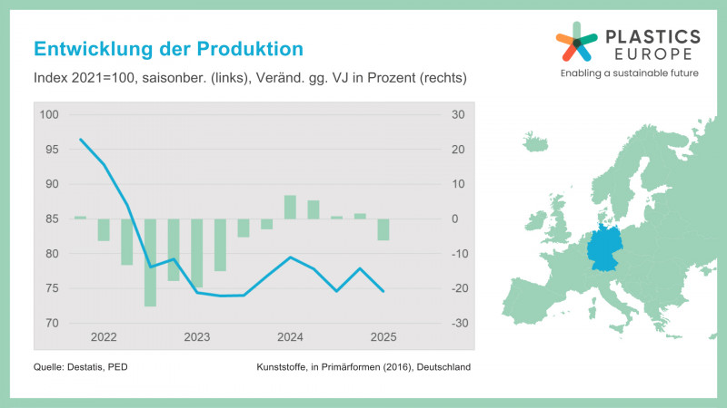 Die Kunststofferzeugung in Deutschland ist im zweiten Quartal 2025 zurückgegangen. Laut Plastics Europe Deutschland, dem Verband der Kunststofferzeuger, sank die Produktion von Kunststoffen in Primärformen um 4,3 Prozent gegenüber dem Vorquartal und lag 6,2 Prozent unter dem Vorjahreswert. Die Erzeugerpreise gaben um 0,6 Prozent nach, im Jahresvergleich waren es 2,4 Prozent. Der Branchenumsatz verringerte sich um 2,4 Prozent auf rund 6,3 Milliarden Euro. Außenhandel steht vor allem unter Druck Während die Exporte von Kunststoffen in Primärformen um 6,7 Prozent zurückgingen, stiegen die Importe auf 4,6 Milliarden Euro. Der Handelsüberschuss schrumpfte, blieb mit 2,1 Milliarden Euro aber weiterhin positiv. Der Verband erwartet für die kommenden Monate keine Verbesserung der Lage. „Die Stagnation ist noch nicht überwunden“, erklärt Dr. Christine Bunte, Hauptgeschäftsführerin von Plastics Europe Deutschland. „Die strukturellen Defizite des Standorts Deutschlands haben sich über Jahre entwickelt. Die Bundesregierung hat begonnen, an den Ursachen wie hohen Energiepreisen und Bürokratiebelastung gegenzusteuern und es wird dauern, bis diese wirken. Allerdings müssen die Reformen noch wesentlich konsequenter umgesetzt werden. Die Kunststofferzeuger in Deutschland werden einen langen Atem brauchen.“ K 2025: Kunststoffbranche sucht Antworten auf Wettbewerbsdruck Angesichts der schlechten Quartalszahlen richtet die Branche im Oktober ihren Blick nach Düsseldorf. Im Mittelpunkt der K 2025 stehen Kreislaufwirtschaft und Wettbewerbsfähigkeit. „Der Innovationsgeist der Unternehmen ist ungebrochen. Bei allen wirtschaftlichen Schwierigkeiten sehen wir, wie neue Impulse umgesetzt werden, sei es bei der Veränderung der Rohstoffbasis, der Reduktion des CO₂-Fußabdrucks von Produkten oder bei der KI-unterstützten Rezepturentwicklung. Die K 2025 wird zeigen, wie die Branche im internationalen Vergleich dasteht und wie sie ihren Antrieb zurückgewinnen kann“, so Bunte. K 2025, 08.-15. Oktober 2025, Düsseldorf, Halle 6, Stand C40 Weitere Informationen: www.plasticseurope.org |