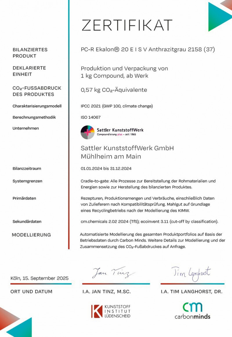 ![]() Kundenspezifisch durchgefärbte Kunststoffgranulate aus Sekundärrohstoffen in den Farbtönen Tiefseeblau, Dunkelgrünblau, Berlinerblau und Delftblau - (Bild: Sattler KunststoffWerk, Clemens Fischer). Ziel war die Berechnung des produktspezifischen CO₂-Fußabdrucks (Product Carbon Footprint PCF) nach ISO 14067 aller rund 300 im Jahr 2024 produzierten Kunststoffcompounds. Grundlage bildeten die unternehmenseigenen ERP-Daten zu Rezepturen, Produktionsmengen und Verpackungen, aus denen für jedes Produkt eine verursachungsgerechte Sachbilanz erstellt wurde. Die Berechnung erfolgte automatisiert innerhalb der Systemgrenzen „cradle to gate“ nach dem Indikator GWP 100a unter Nutzung einer spezialisierten PCF-Datenbank. Berücksichtigt wurden Rohstoffe, Energieeinsatz, Hilfs- und Verpackungsmaterialien. Sekundärrohstoffe aus offenen Recyclingkreisläufen wurden nach dem "Cut-off"-Ansatz bewertet. Additive unterhalb definierter Mengenschwellen wurden gemäß Abschneidekriterium behandelt. Innerhalb von sechs Monaten konnten für das gesamte Portfolio prüffähige, konsistente PCF-Zertifikate erstellt werden. Die Ergebnisse dienen als belastbare Datengrundlage für die CO₂-Bilanzierung entlang der Lieferkette und zeigen einen praxisnahen Ansatz zur effizienten Umweltbilanzierung komplexer Produktportfolios. Weitere Informationen: |