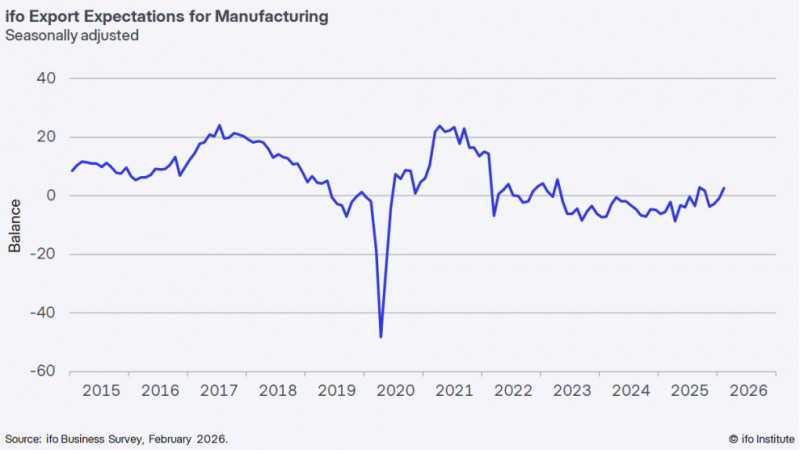 Sentiment in the German export industry has improved again. The ifo Export Expectations rose to +2.6 points in February, up from -0.8 points in January. “The export economy is starting the new year with a bit of tailwind,” says Timo Wollmershäuser, Head of Forecasts at the ifo Institute. “However, it’s still too soon to talk of a broad-based and dynamic recovery.”