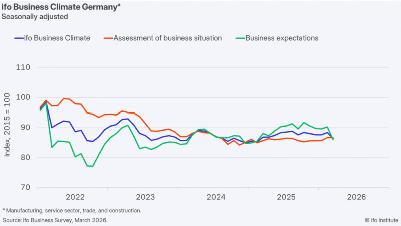 Sentiment among companies in Germany has dropped by a considerable degree. The ifo Business Climate Index fell in March to 86.4 points, down from 88.4 points in February as a result of more pessimistic expectations. Assessments of the current situation, however, remain unchanged. Uncertainty among companies has increased noticeably. The war in Iran has put any hope of a recovery on ice for the time being.