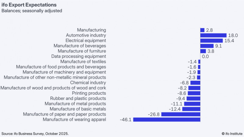 Sentiment in the German export industry has clouded over. The ifo Export Expectations fell to +2.8 points in October, down from +3.4 points in September. “The German export industry is stuck in a rut,” says Klaus Wohlrabe, Head of Surveys at ifo. “There is no real recovery in sight.”