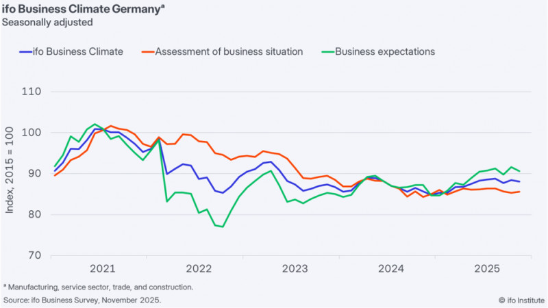 Sentiment among companies in Germany has deteriorated. The ifo Business Climate Index fell to 88.1 points in November, down from 88.4 points in October, due to more pessimistic expectations. On the other hand, companies assessed their current situation as somewhat more positive. They have little faith that a recovery is coming anytime soon. In manufacturing, the index fell. Expectations in particular took a significant hit. Companies are more skeptical about the months ahead. They reported lower order books. Current business conditions, however, were slightly better. In the service sector, the business climate improved once again. Service providers assessed the current situation as somewhat more positive; however, their expectations deteriorated slightly. There was a noticeable setback in the transport and logistics sector, while sentiment in tourism brightened significantly. In trade, the business climate deteriorated. Companies assessed their current situation as somewhat worse, and expectations also declined. Retailers, in particular, were disappointed at the start of the Christmas season. In construction, the index recorded a decline. While the current situation shows a clear upward trend, expectations were once again more pessimistic. Weak demand remains a decisive bottleneck. More information: www.ifo.de |