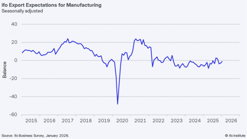 Sentiment in the German export industry has improved somewhat. The ifo Export Expectations rose to -1.2 points in January, up from -3.0 points in December. “Even though companies are less skeptical with regard to their international business, uncertainty remains high,” says Klaus Wohlrabe, Head of Surveys at ifo. “There are no clear signs of an upward trend for the first quarter of 2026.” The automotive industry and manufacturers of electrical equipment are somewhat more confident about international business and expect to increase their exports. In metal production and processing, the pessimism that has persisted for many years is noticeably receding. Export expectations rose to their highest level since February 2022, with positive and negative assessments currently in balance. In the beverage industry, companies expect a stable and expansive export environment. By contrast, manufacturers of clothing and food, and the printing industry continue to expect exports to decline. More information: www.ifo.de |