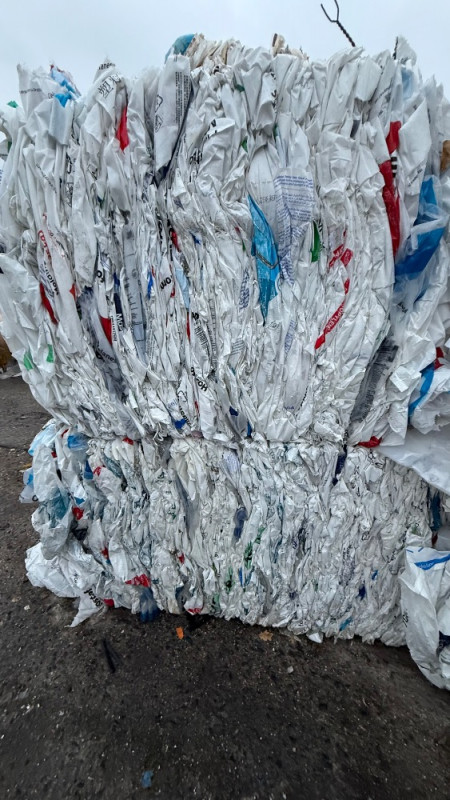 Weiße Polyethylen (PE)-Säcke aus Granulat, gepresst in Ballen.
