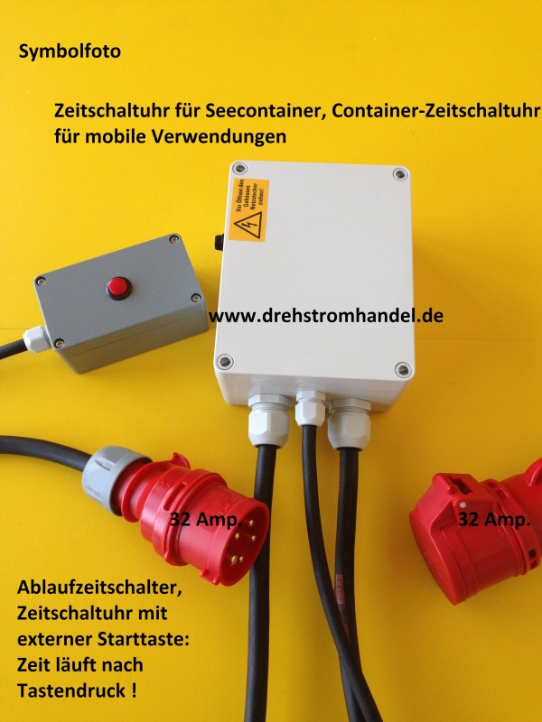 Container-Drehstrom-Ablauftimer / Drehstrom-Zeitschaltuhr zur zeitverzögerten Abschaltung von Geräten, welche per Drehstrom 400 Volt / 32 Ampère betrieben werden. Externe Starttaste - begrenzte, voreingestellte Zeit läuft ab. Nach Zeitablauf ist ein neuerliches Betätigen des Tasters nötig.