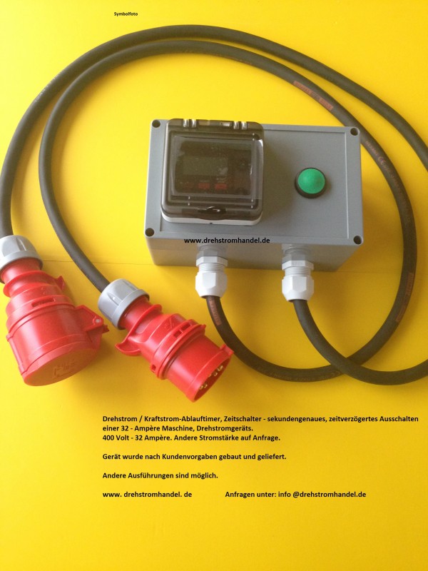 Drehstrom-Ablauftimer (staubgeschützte Ausführung) zur zeitverzögerten Abschaltung von Geräten, welche per Drehstrom 400 Volt / 32 Ampère betrieben werden. Timer mit ca. 9 bzw. 99 Stunden Laufzeit, sekundengenau einstellbar. 2 Kontrolllampen, Gummischlauchleitung, CEE-Schlauchleitung.