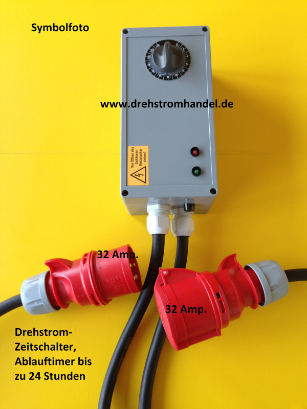 Drehstrom-Ablauftimer, Zeitschaltuhr für geeignete Drehstromgeräte, welche zeitversetzt ein- oder ausgeschaltet werden sollen. Vorwahl: bis zu 24 Stunden.