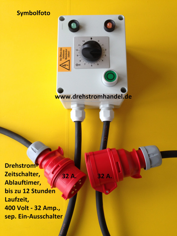 Drehstrom-Zeitschaltuhr als Ablaufzeitschaltuhr zum sicheren Ausschalten von Anlagen oder Anlagenteilen, welche mit Drehstrom 400 Volt / 32 Ampère betrieben werden.