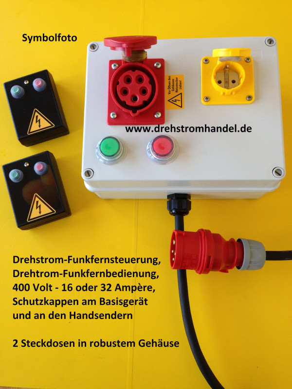 Drehstrom-Funkfernsteuerung, 400 Volt - 16 oder 32 Amp., 2 Steckdosen zur Entnahme, 2 Handsender, Schutzkappen