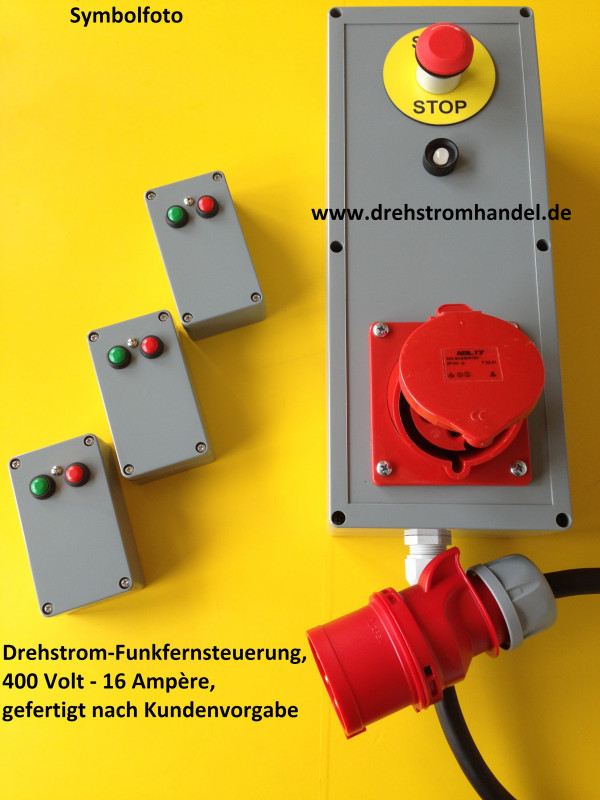Funkfernsteuerung / Funkfernbedienung für Drehstrom / Kraftstrom zur Bedienung von geeigneten Geräten, Aggregaten, Zubehörteilen per Funk. Drehstrom 400 Volt / 16 Ampère.