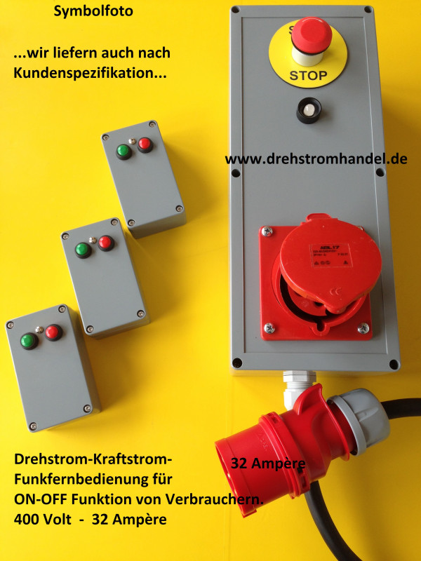 Funkfernsteuerung / Funkfernbedienung für Drehstrom / Kraftstrom zur Bedienung von geeigneten Geräten, Aggregaten, Zubehörteilen per Funk. Drehstrom 400 Volt / 32 Ampère.