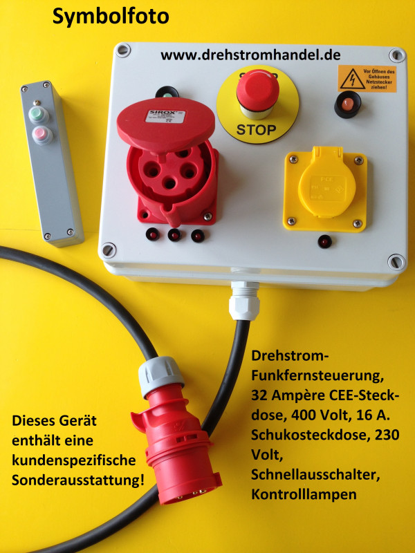 Funkfernsteuerung zur Bedienung von geeigneten Geräten, Aggregaten, Zubehörteilen per Funk. Drehstrom 400 Volt / 32 Ampère CEE-Steckdose und zusätzlich eine 230 Volt / 16 Ampère Steckdose.