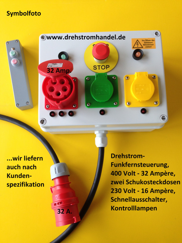 Drehstrom-Funkfernsteuerung mit CEE-Steckvorrichtung, 400 Volt - 32 Ampère und zwei Schukosteckdosen 230 Volt