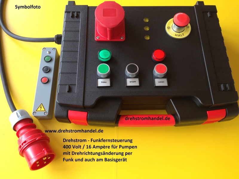 Funkfernsteuerung zur Bedienung von geeigneten Geräten, Aggregaten, Zubehörteilen per Funk. Drehstrom 400 Volt / mit Sonderfunktionen, alle Geräte werden mit Gummischlauchleitungen und CEE-Steckern / CEE-Kupplung / Steckdose ausgeliefert, geprüft und sofort einsetzbar. Schnell-Aus-Schalter. Kontrolllampen.