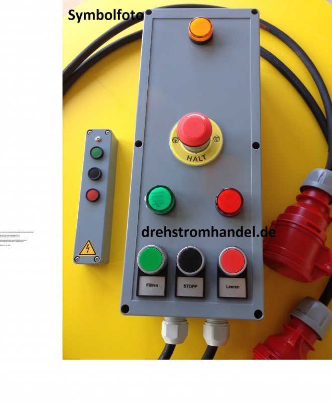 Funkfernsteuerung zur Bedienung von geeigneten Geräten, Aggregaten, Zubehörteilen per Funk. Drehstrom 400 Volt / mit diversen Sonderfunktionen. Alle Geräte werden mit Gummischlauchleitungen und CEE-Steckern / CEE-Kupplung / Steckdose ausgeliefert, geprüft und sofort einsetzbar. Schnell-Aus-Schalter. Kontrolllampen.
