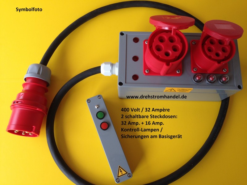 Funkfernsteuerung zur Bedienung von geeigneten Geräten, Aggregaten, Zubehörteilen per Funk. Drehstrom 400 Volt / 32 Ampère Steckdose und Drehstrom 16 Ampère Steckdose, alle Geräte werden mit Gummischlauchleitungen und CEE-Steckern / CEE-Kupplung / Steckdose ausgeliefert, geprüft und sofort einsetzbar. Sicherungen. Kontrolllampen.