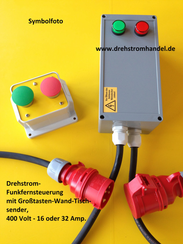 Drehstrom-Funkfernsteuerung, nach Kundenangaben gebaut - mit Großtasten-Funk-Wand-Tisch-Sender. 16 oder 32 Ampère, komplett mit Gummischlauchleitungen und Steckvorrichtungen, geprüft und sofort einsatzbereit.