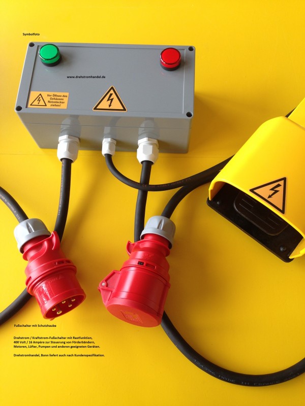 Drehstrom-Fußschalter / Fußpedal mit Schutzhaube - zur Steuerung geeigneter Geräte wie Förderbänder etc., 400 / 16 Ampère komplett mit Gummischlauchleitungen und Steckvorrichtungen, geprüft und sofort einsatzbereit.