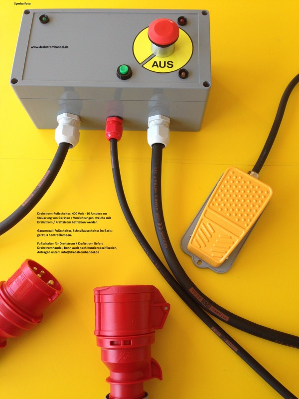 Drehstrom-Fußschalter / Fußpedal - zur Steuerung geeigneter Geräte wie Förderbänder etc., 400 / 230 Volt / 16 Ampère komplett mit Gummischlauchleitungen und Steckvorrichtungen, geprüft und sofort einsatzbereit.