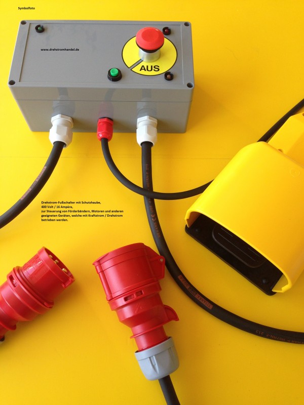 Drehstrom-Fußschalter / Fußpedal mit Schutzhaube - zur Steuerung geeigneter Geräte wie Förderbänder etc., 400 / 16 Ampère komplett mit Gummischlauchleitungen und Steckvorrichtungen, geprüft und sofort einsatzbereit. Schnellausschalter im Basisgerät.