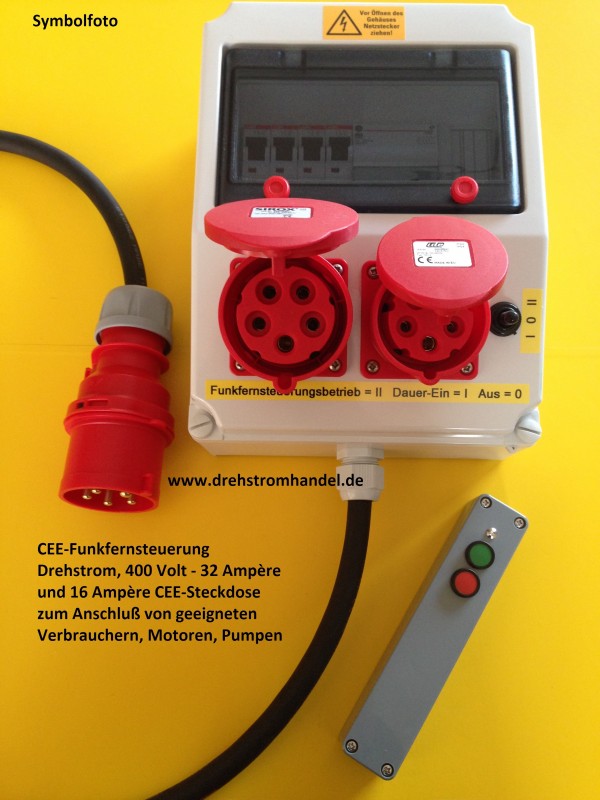 Funkfernsteuerung für Drehstrommotoren, Drehstrom / Kraftstrom 400 Volt / 32 Ampère mit 2 CEE-Steckdosen 32 Amp. und 16 Amp. Komplett mit Handsender.