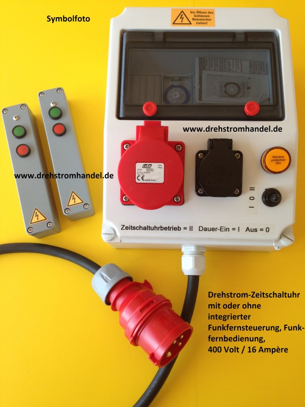 Drehstrom-Zeitschaltuhr mit oder ohne integrierte Funkfernsteuerung / Funkfernbedienung. Vorliegendes Gerät wurde nach Kundenangaben gefertigt. Zur Bedienung von geeigneten Geräten, Aggregaten, Zubehörteilen per Funk. Drehstrom 400 Volt / 16 Ampère für einfache Schaltaufgaben.