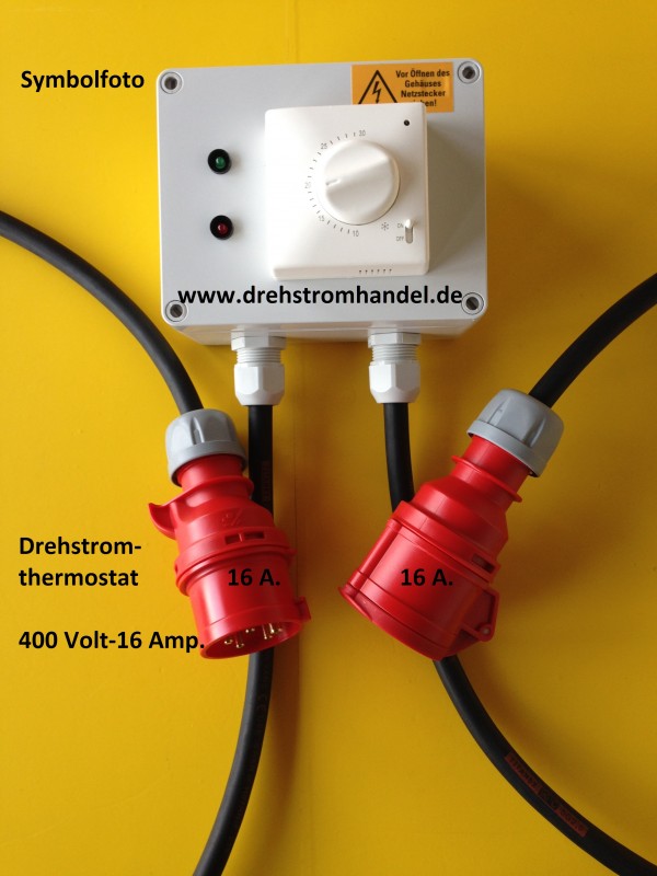 Drehstromthermostat zur Regulierung der Temperatur von Lagerräumen, Werkstätten etc., 400 Volt / 16 Ampère zur Schaltung von geeigneten Heizgeräten, Industrieheizern etc. - zur Regelung der Raumtemperatur.