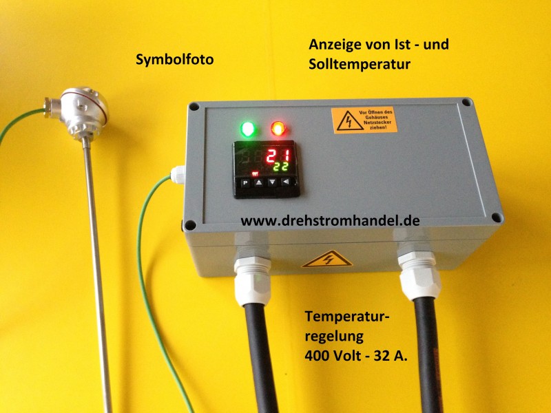 Drehstromthermostat zur Regulierung der Temperatur, Temperaturrgelung etc., 400 Volt / 32 Ampère zur Schaltung von geeigneten Heizgeräten, Industrieheizern etc. - mit integrierter digitaler Anzeige der Ist- und der Solltemperatur.