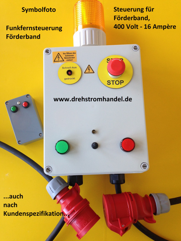 Förderbandsteuerung als Funkfernsteuerung - für Drehstrom / Kraftstrom zur Steuerung geeigneter Geräte, 400 Volt / 16 Ampère komplett mit Gummischlauchleitungen und CEE-Steckern,