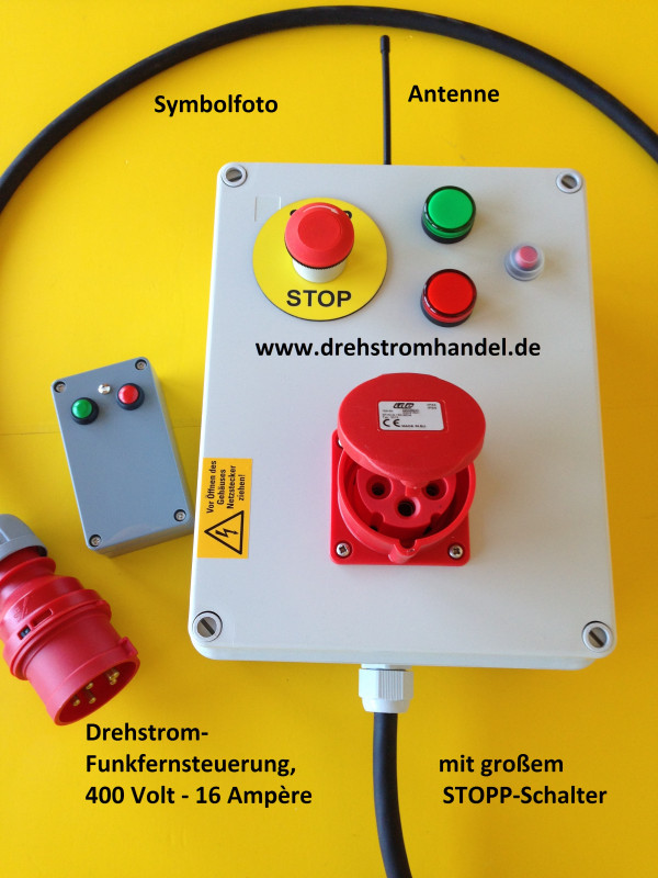 Funkfernsteuerung 400 Volt / 16 Ampère - Aussenantenne, Stopp-Schalter, Bedienung per Funk oder stationär am Basisgerät