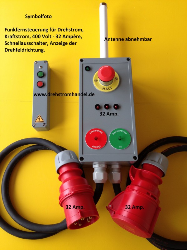 Funkfernsteuerung für Drehstrommotoren, Drehstrom / Kraftstrom 400 Volt / 32 Ampère mit integrierter Anzeige der Drehfeldrichtung - Schaltzustandskontrolllampen, Netzspannungsanzeige - komplett mit Handsender. Not-Halt / Schnell-Aus-Schalter - als Schlagschalter integriert. Abnehmbare Antenne.